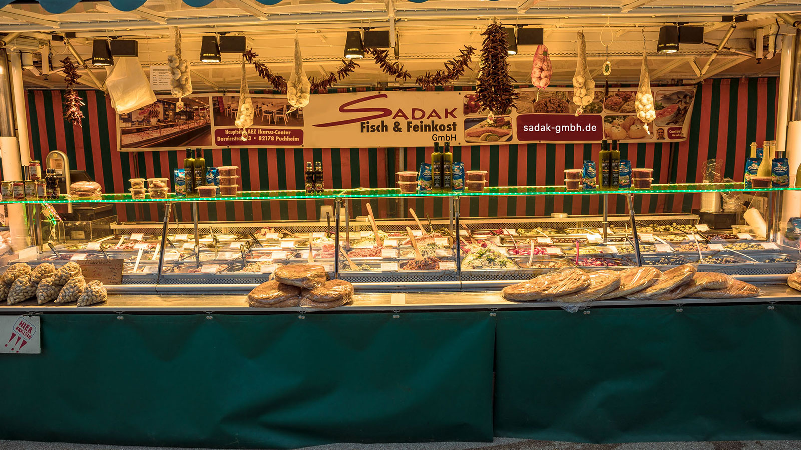 Bei uns bekommen Sie die verschiedensten Fischsorten, Garnelen in unterschiedlichen Größen, die besten Oliven aus ganz Europa, Ziegen-, Schafs- und Fetakäse aus Griechenland, gefüllte Oliven und Peperoni, Anitpasti, selbstgemachte Brotaufstriche und unser beliebtes Fladenbrot, kaltgepresstes Olivenöl der feinsten Art, eine große Auswahl an Knoblauchsorten sowie eine große Vielzahl an Trockenfrüchten.
